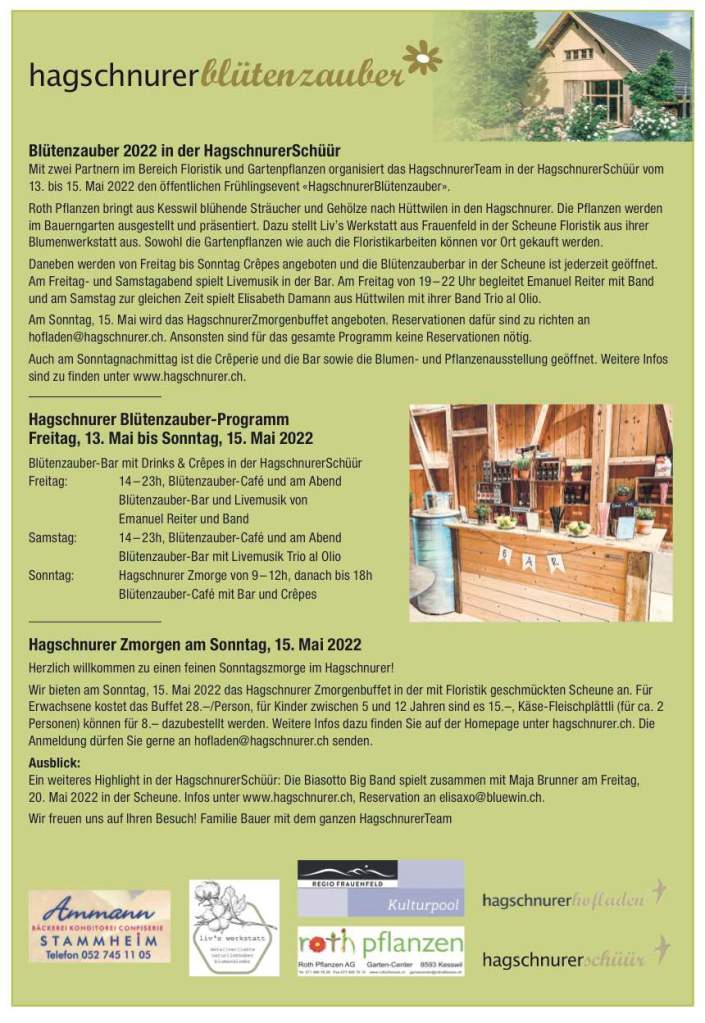 Am Sonntag, 15. Mai wird das HagschnurerZmorgenbuffet angeboten. Reservationen dafür sind zu richten an hofladen@hagschnurer.ch. Ansonsten sind für das gesamte Programm keine Reservationen nötig.
