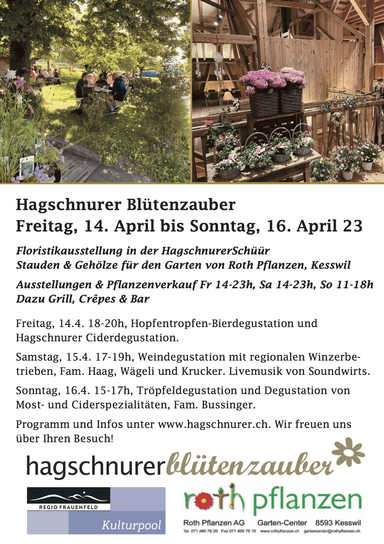 Roth Pflanzen bringt aus Kesswil blühende Sträucher und Gehölze nach Hüttwilen in den Hagschnurer. Die Pflanzen werden im Bauerngarten ausgestellt und präsentiert. Dazu stellt Liv’s Werkstatt aus Frauenfeld in der Scheune Floristik aus ihrer Blumenwerkstatt aus. Sowohl die Gartenpflanzen wie auch die Floristikarbeiten können vor Ort gekauft werden.