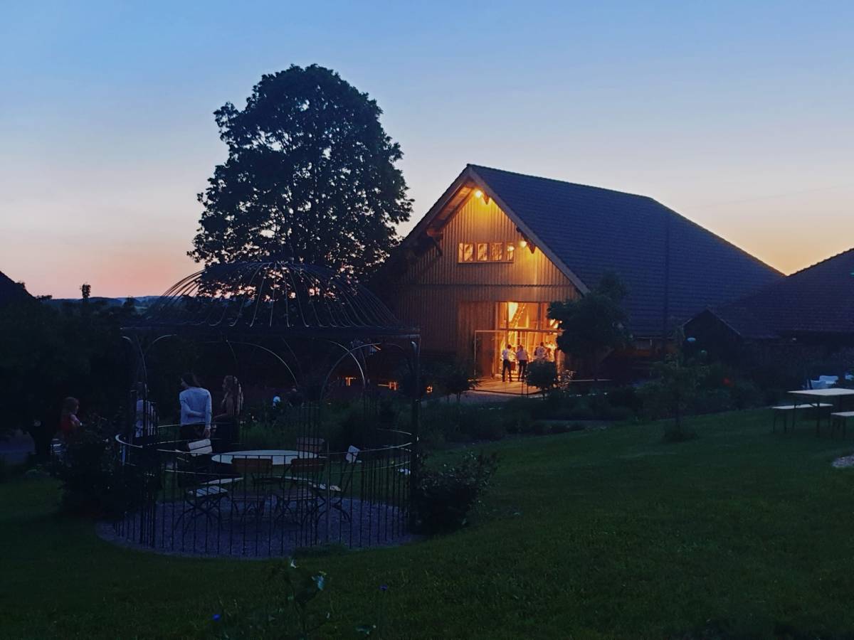 Heubodenzimmer mit Hotpot unter den Obstbäumen